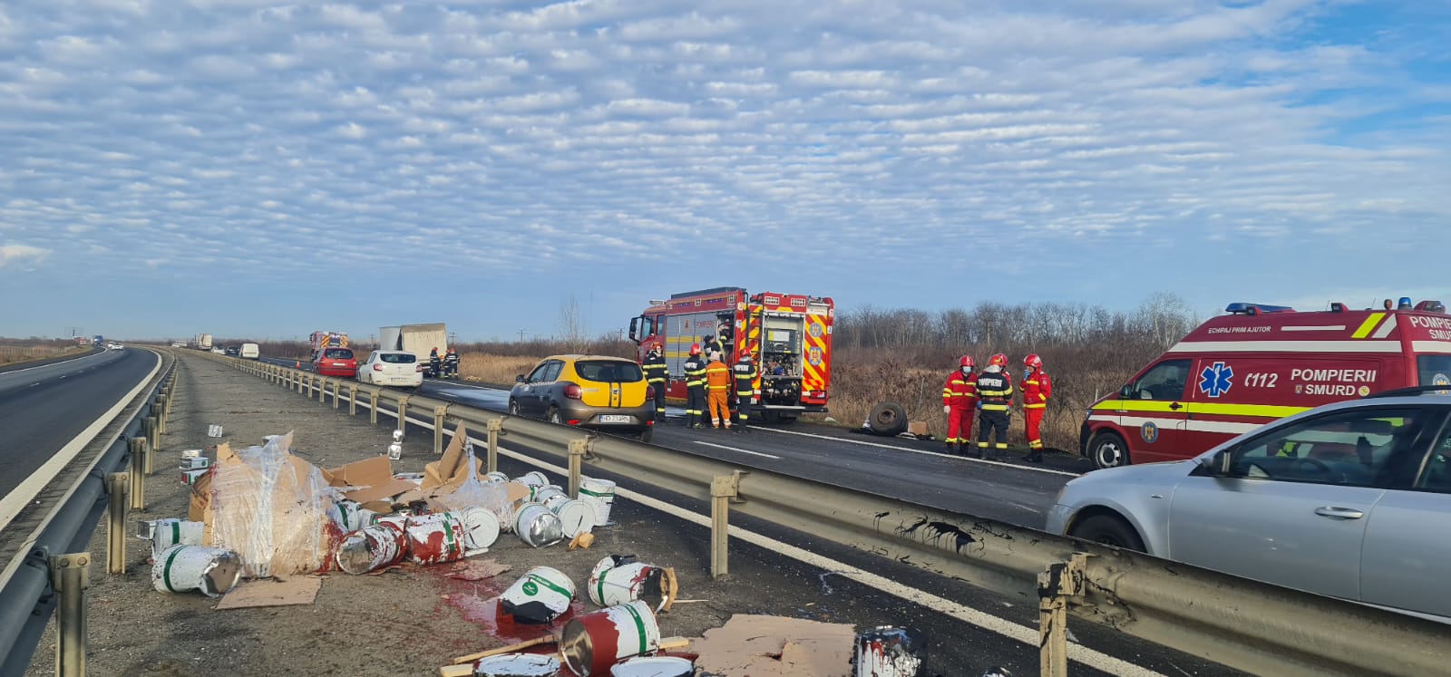 Real pericol, un camion încărcat cu recipiente pline cu vopsea,  s-a răsturnat