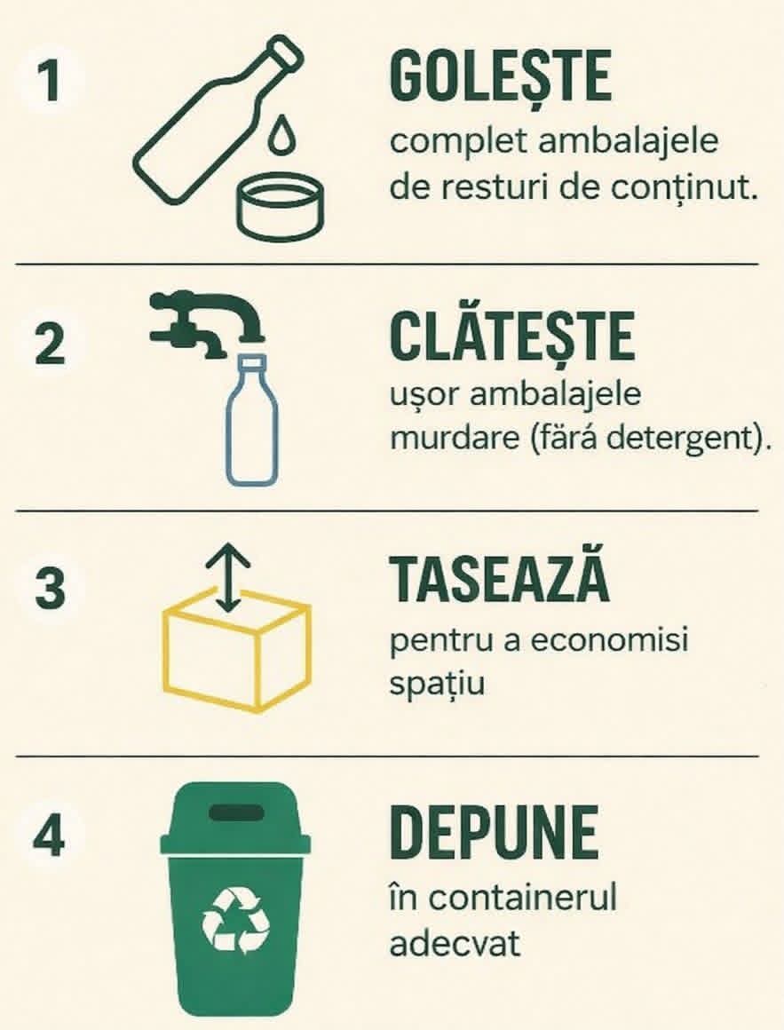 Primul pas este colectarea separată, care presupune ca ambalajele să ajungă curate și sortate corespunzător în containerele dedicate. Fiecare ambalaj golit de conținut, curățat ușor și depus în fracția corectă are șanse reale să fie valorificat și reintegrat în economie.