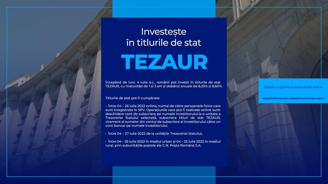 Începând de luni, 4 iulie a.c., românii pot investi în titlurile de stat TEZAUR, cu maturități de 1 și 3 ani și dobânzi anuale de 8,25% și 8,6%. Titlurile de stat au valoare nominală de 1 leu și sunt în forma dematerializată. Interesul românilor pentru titlurile de stat TEZAUR s-a menținut la un nivel ridicat și în luna iunie, suma investită fiind de 1,39 miliarde lei.