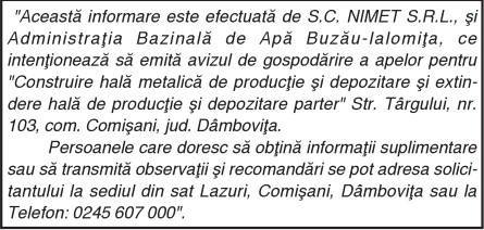 S.C. NIMET S.R.L By: Ziarul Dambovita Date: 07/12/2018 FacebookTwitterPinterestWhatsApp S.C. NIMET S.R.L TagsS.C. NIMET S.R.L Articolul precedentPETRUŢA IUGULESCU VA ARBITRA LA MONDIALUL FEMININArticolul următorANUNŢ Ziarul Dambovita LĂSAȚI UN MESAJ Renunțați la răspuns Comentariu: Vă rugăm să introduceți comentariul dvs.! Nume:* Introduceți aici numele dvs. Email:* Ați introdus o adresă de e-mail incorectă! Vă rugăm să introduceți adresa dvs. de e-mail aici Website: Salvați numele meu, adresa de e-mail și site-ul web în acest browser pentru data viitoare i comentariu. Δ Acest site folosește Akismet pentru a reduce spamul. Află cum sunt procesate datele comentariilor tale. Popular Adrenalină și suspans la Cinema Independența din Târgoviște: „Anaconda” ajunge pe marele ecran A apărut Almanahul bisericesc 2026 al Arhiepiscopiei Târgoviștei – o oglindă a vieții pastorale și academice contemporane CJ Dâmbovița încheie o nouă ediție a programului de internship Avertisment pentru turiști: Recomandările jandarmilor montani înainte de urcarea în Bucegi Restricții de circulație în Ungaria, pe Drumul Principal 42 punct frontieră Artand-Borș, începând cu 1 ianuarie 2026! ȘtiriDâmbovița Județul Dâmbovița, sub asediul gerului – temperaturi de până la -11 grade Celsius Roxana - Ionela Botea - 02/01/2026 Dimineață geroasă – 2 ianuarie , temperaturi minime înregistrate... Vești bune pentru fermieri: începe depunerea cererilor pentru bunăstarea animalelor (DR-06) Roxana - Ionela Botea - 02/01/2026 Fermierii din sectorul zootehnic au motive de optimism la... Mani Gyenes, din nou la startul Raliului Dakar: România are reprezentant în cursa supremă a anduranței Roxana - Ionela Botea - 02/01/2026 România va fi din nou reprezentată la cel mai... Noi taxe și impozite în vigoare de la 1 ianuarie 2026 Roxana - Ionela Botea - 02/01/2026 Începând cu 1 ianuarie 2026, în România au intrat...