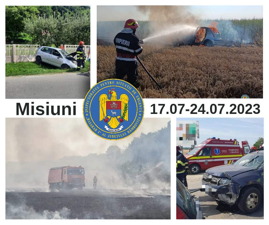 În perioada 17 iulie – 24 iulie 2023, echipajele de intervenţie din cadrul Inspectoratului pentru Situaţii de Urgenţă „Basarab I” al judeţului Dâmboviţa au acționat la 368 de evenimente:23 incendii (locuinţe, anexe gospodăreşti, vegetație uscată etc.); 12 acțiuni la accidente rutiere; 10 acțiuni pentru înlăturarea efectelor negative ale manifestării fenomenelor meteorologice; 31 acţiuni la alte situaţii de urgenţă (acțiuni pentru asistența persoanelor aflate în dificultate , deblocări de ușă, salvări animale, asigurare zonă etc.);293 cazuri medicale.