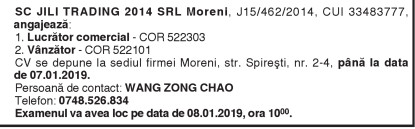 SC JILI TRADING 2014 SRL Moreni, J15/462/2014, CUI 33483777, angajează: By: Ziarul Dambovita Date: 07/01/2019 FacebookTwitterPinterestWhatsApp SC JILI TRADING 2014 SRL Moreni, J15/462/2014, CUI 33483777, angajează: TagsANGAJEAZĂ:CUI 33483777J15/462/2014SC JILI TRADING 2014 SRL Moreni Articolul precedentANUNŢ PUBLICArticolul următorA ajuns cu maşina în gardul unei case din satul Lazuri, comuna Comişani Ziarul Dambovita LĂSAȚI UN MESAJ Renunțați la răspuns Comentariu: Vă rugăm să introduceți comentariul dvs.! Nume:* Introduceți aici numele dvs. Email:* Ați introdus o adresă de e-mail incorectă! Vă rugăm să introduceți adresa dvs. de e-mail aici Website: Salvați numele meu, adresa de e-mail și site-ul web în acest browser pentru data viitoare i comentariu. Δ Acest site folosește Akismet pentru a reduce spamul. Află cum sunt procesate datele comentariilor tale. Popular Adrenalină și suspans la Cinema Independența din Târgoviște: „Anaconda” ajunge pe marele ecran A apărut Almanahul bisericesc 2026 al Arhiepiscopiei Târgoviștei – o oglindă a vieții pastorale și academice contemporane CJ Dâmbovița încheie o nouă ediție a programului de internship Avertisment pentru turiști: Recomandările jandarmilor montani înainte de urcarea în Bucegi Restricții de circulație în Ungaria, pe Drumul Principal 42 punct frontieră Artand-Borș, începând cu 1 ianuarie 2026! ȘtiriDâmbovița Județul Dâmbovița, sub asediul gerului – temperaturi de până la -11 grade Celsius Roxana - Ionela Botea - 02/01/2026 Dimineață geroasă – 2 ianuarie , temperaturi minime înregistrate... Vești bune pentru fermieri: începe depunerea cererilor pentru bunăstarea animalelor (DR-06) Roxana - Ionela Botea - 02/01/2026 Fermierii din sectorul zootehnic au motive de optimism la... Mani Gyenes, din nou la startul Raliului Dakar: România are reprezentant în cursa supremă a anduranței Roxana - Ionela Botea - 02/01/2026 România va fi din nou reprezentată la cel mai... Noi taxe și impozite în vigoare de la 1 ianuarie 2026 Roxana - Ionela Botea - 02/01/2026 Începând cu 1 ianuarie 2026, în România au intrat...