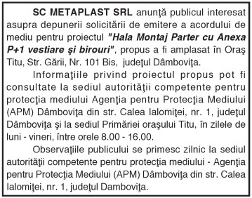 SC METAPLAST SRL By: Ziarul Dambovita Date: 23/04/2019 FacebookTwitterPinterestWhatsApp SC METAPLAST SRL TagsSC METAPLAST SRL Articolul precedentANUNŢ PUBLICArticolul următorDe Florii, locuitorii din Ulmi au sărbătorit Ziua Comunei alături de ministrul Rovana Plumb Ziarul Dambovita LĂSAȚI UN MESAJ Renunțați la răspuns Comentariu: Vă rugăm să introduceți comentariul dvs.! Nume:* Introduceți aici numele dvs. Email:* Ați introdus o adresă de e-mail incorectă! Vă rugăm să introduceți adresa dvs. de e-mail aici Website: Salvați numele meu, adresa de e-mail și site-ul web în acest browser pentru data viitoare i comentariu. Δ Acest site folosește Akismet pentru a reduce spamul. Află cum sunt procesate datele comentariilor tale. Popular Adrenalină și suspans la Cinema Independența din Târgoviște: „Anaconda” ajunge pe marele ecran A apărut Almanahul bisericesc 2026 al Arhiepiscopiei Târgoviștei – o oglindă a vieții pastorale și academice contemporane CJ Dâmbovița încheie o nouă ediție a programului de internship Avertisment pentru turiști: Recomandările jandarmilor montani înainte de urcarea în Bucegi Restricții de circulație în Ungaria, pe Drumul Principal 42 punct frontieră Artand-Borș, începând cu 1 ianuarie 2026! ȘtiriDâmbovița Județul Dâmbovița, sub asediul gerului – temperaturi de până la -11 grade Celsius Roxana - Ionela Botea - 02/01/2026 Dimineață geroasă – 2 ianuarie , temperaturi minime înregistrate... Vești bune pentru fermieri: începe depunerea cererilor pentru bunăstarea animalelor (DR-06) Roxana - Ionela Botea - 02/01/2026 Fermierii din sectorul zootehnic au motive de optimism la... Mani Gyenes, din nou la startul Raliului Dakar: România are reprezentant în cursa supremă a anduranței Roxana - Ionela Botea - 02/01/2026 România va fi din nou reprezentată la cel mai... Noi taxe și impozite în vigoare de la 1 ianuarie 2026 Roxana - Ionela Botea - 02/01/2026 Începând cu 1 ianuarie 2026, în România au intrat...
