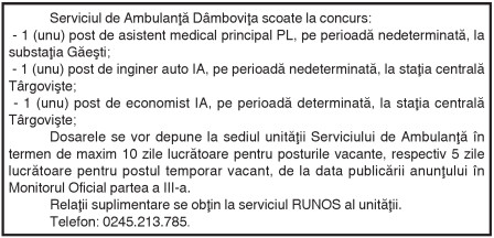 Share Facebook Twitter Pinterest Email Copy Link Serviciul de Ambulanţă Dâmboviţa scoate la concurs: Serviciul de Ambulanţă Dâmboviţa scoate la concurs