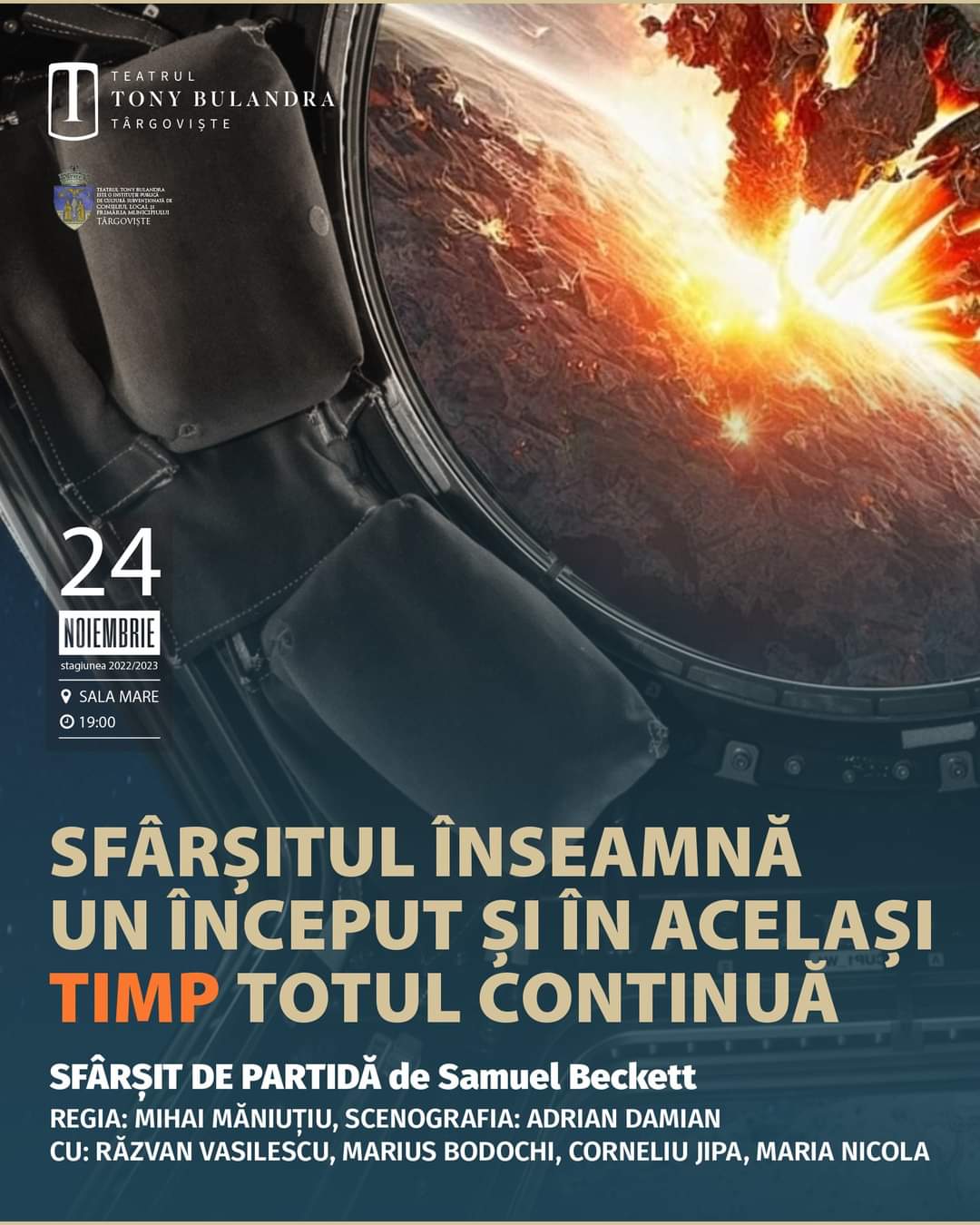 Așadar, nu ratați spectacolul „Sfârșit de partidă” de Samuel Beckett, regia:Mihai Mănuțiu, traducerea: Ștefana Pop-Curșeu și Irina Mavrodin, scenografia: Adrian Damian, sound design: Mihai Dobre, în distribuție:Răzvan Vasilescu , Marius Bodochi, Corneliu Jipa, Maria Nicola