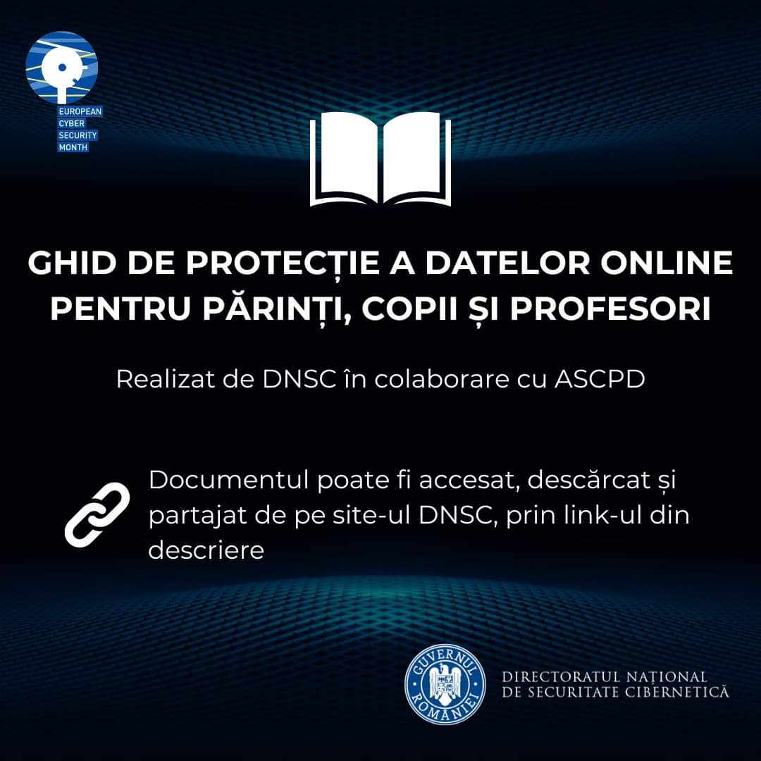Informații personale precum numele, adresa sau locația pot fi ușor expuse dacă nu suntem atenți. Acesta este motivul pentru care DNSC, împreună cu ASCPD, a realizat un ghid special destinat părinților, copiilor și profesorilor, oferind sfaturi concrete pentru protejarea datelor personale în mediul online.