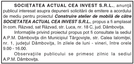 SOCIETATEA ACTUAL CEA INVEST S.R.L. By: Ziarul Dambovita Date: 24/06/2019 FacebookTwitterPinterestWhatsApp SOCIETATEA ACTUAL CEA INVEST S.R.L. Articolul precedentANUNŢ DE LICITAŢIE privind concesionarea prin licitaţie publică a imobilelor – teren şi construcţii -aferente Taberei şcolare Cerbul, situată în comuna Moroeni, aflate în proprietatea publică a judeţului DâmboviţaArticolul următorS.C. ENGIE ROMANIA S.A. Ziarul Dambovita LĂSAȚI UN MESAJ Renunțați la răspuns Comentariu: Vă rugăm să introduceți comentariul dvs.! Nume:* Introduceți aici numele dvs. Email:* Ați introdus o adresă de e-mail incorectă! Vă rugăm să introduceți adresa dvs. de e-mail aici Website: Salvați numele meu, adresa de e-mail și site-ul web în acest browser pentru data viitoare i comentariu. Δ Acest site folosește Akismet pentru a reduce spamul. Află cum sunt procesate datele comentariilor tale. Popular Mecanism de control al concediilor medicale pe mai multe palierer, dacă se constată că certificatul de concediul medical a fost eliberat fără respectarea... Primarul Târgoviștei critică dur modificările legislative privind taxele locale: Unul dintre cele mai cinice acte normative din ultimii 30 de ani Avertisment privind fraudele online de tip „romance scam”, la început de an Informare meteorologică în vigoare în județul Dâmbovița: precipitații, vânt puternic și risc de polei Adrenalină și suspans la Cinema Independența din Târgoviște: „Anaconda” ajunge pe marele ecran ȘtiriDâmbovița Mecanism de control al concediilor medicale pe mai multe palierer, dacă se constată că certificatul de concediul medical a fost eliberat fără respectarea... Roxana - Ionela Botea - 03/01/2026 Control la nivelul Caselor de Asigurări de Sănătate, sub... Chindia Târgoviște spune că nu sunt adevărate informațiile privind o ofertă de 10.000 de euro/lună pentru Daniel Popa Roxana - Ionela Botea - 03/01/2026 Clubul Chindia Târgoviște a reacționat oficial după apariția în... Primarul Târgoviștei critică dur modificările legislative privind taxele locale: Unul dintre cele mai cinice acte normative din ultimii 30 de ani Roxana - Ionela Botea - 03/01/2026 Primarul municipiului Târgoviște, Daniel Cristian Stan, a transmis un... Avertisment privind fraudele online de tip „romance scam”, la început de an Roxana - Ionela Botea - 03/01/2026 La început de an, perioada în care mulți oameni...