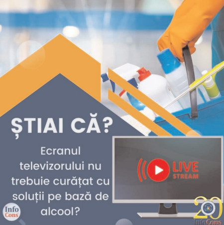 Alcoolul și amoniacul, care se găsesc în produsele de curățat geamuri, pot face ravagii pe televizorul tău scump cu ecran plat, așa că nu folosi produse de curățare care le au. Dacă decideți să utilizați un „detergent pentru ecran” ambalat – de care nu aveți nevoie cu adevărat– alegeți unul care să nu conțină alcool, amoniac sau acetonă. De asemenea, nu utilizați produse de curățare care conțin un abraziv care poate zgâria ecranul.