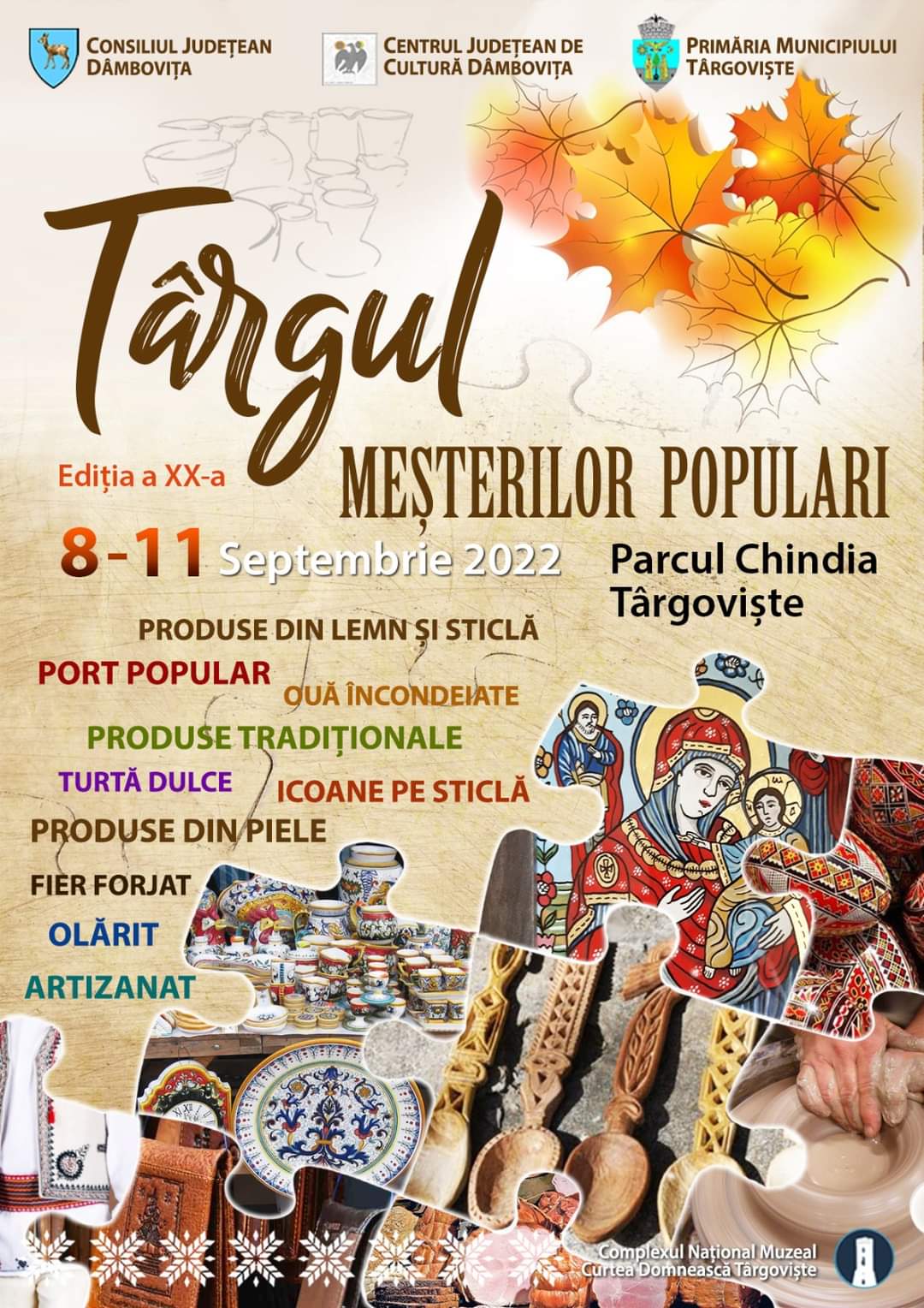În cadrul evenimentului „Zilele Cetății”, Centrul Județean de Cultură Dâmbovița organizează Târgul meșterilor populari, ediția a XX-a, care se va desfășura în Parcul Chindiei, în perioada mai sus amintită, între orele 10:00-22:00.