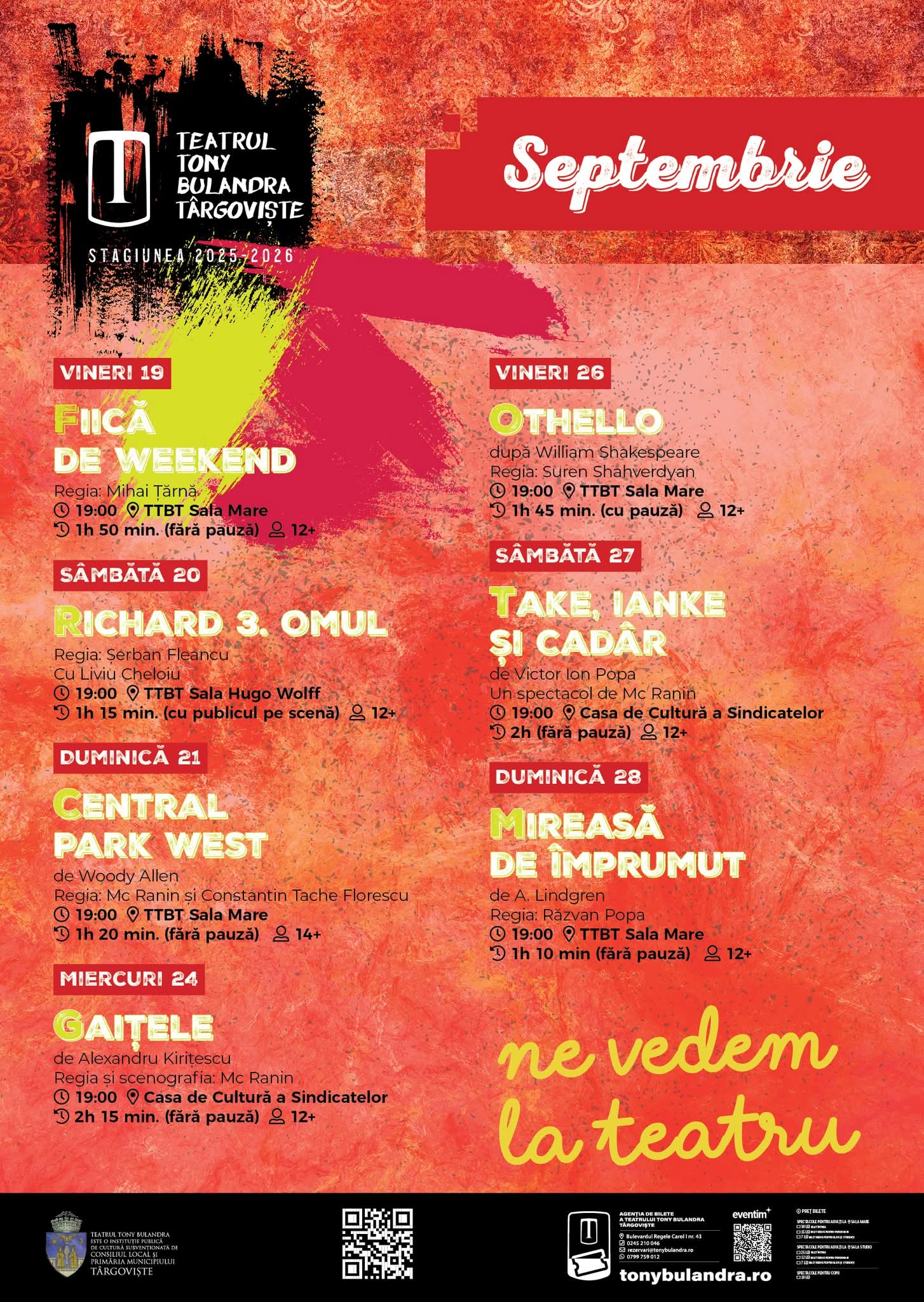 Luna aceasta, Teatrul Tony Bulandra din Târgoviște aduce pe scenă o serie de reprezentații captivante pentru toate gusturile: comedii savuroase, drame emoționante și spectacole pentru copii. Fiecare reprezentație promite să transforme o seară obișnuită într-o experiență culturală de neuitat.