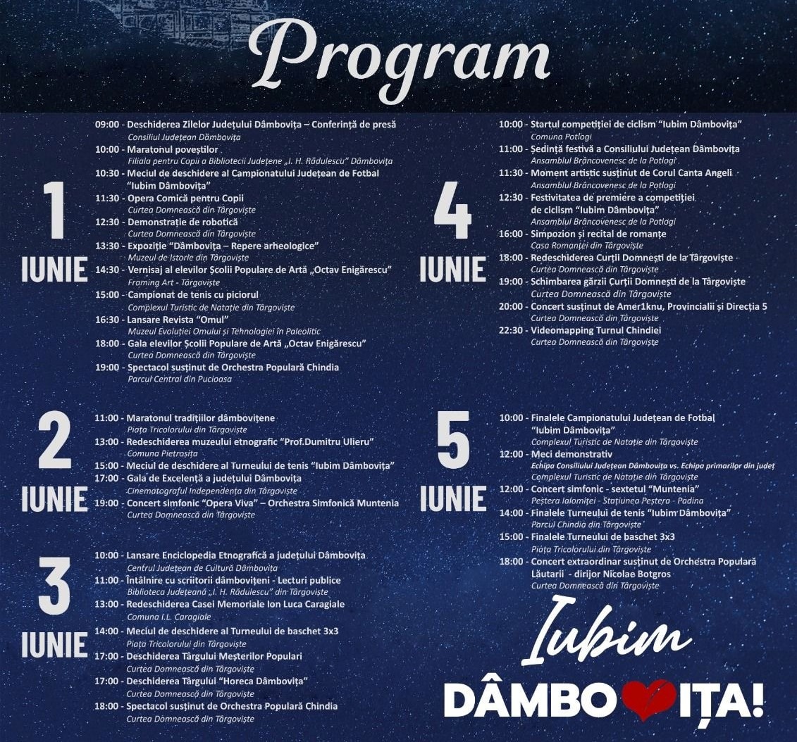 Organizat cu prilejul împlinirii a 510 ani de la prima dovadă scrisă a existenței județului Dâmbovița ca entitate teritorială, evenimentul urmărește să devină o sărbătoare anuală, care, prin varietatea manifestărilor, să le aducă cetățenilor acestor meleaguri mândria de a fi dâmbovițeni, să promoveze valorile cultural-istorice, specificul dâmbovițean și pe dâmbovițenii care, prin realizările lor, vorbesc țării și chiar lumii despre județul nostru.. Deschiderea „Zilelor Județului Dâmbovița” va avea loc pe data de 1 iunie, la ora 9:00, și tot pe 1 iunie vom avea deschiderea campionatului de fotbal, care se va desfășura în multe localități din județ. Tot pe 1 iunie vom avea și o gală de premiere a elevilor de la Școala Populară de Artă „Octav Enigărescu”. Pe 2 iunie, vom avea Maratonul tradițiilor dâmbovițene, eveniment organizat de Biblioteca Județeană. Tot pe 2 iunie vom da startul turneului de tenis, la nivelul județului Dâmbovița, iar evenimentul principal al zilei va fi gala de excelență, unde îi vom premia pe cei care și-au adus contribuția pentru județul Dâmbovița, oameni din toate domeniile, care ne reprezintă și astăzi la nivel național și internațional. Pe 3 iunie, vom lansa enciclopedia etnografică a județului Dâmbovița, eveniment organizat de Centrul Județean de Cultură Dâmbovița. Tot pe 3 iunie vom redeschide atât Muzeul „Ion Luca Caragiale”, care a fost în reabilitare, cât și muzeul de la Pietroșița. La ora 17:00, vom deschide Târgul Meșterilor Populari. 4 iunie va fi ziua cea mai importantă, când se împlinesc 510 ani de la atestarea județului Dâmbovița. La ora 11:00 vom avea ședința festivă a consiliului județean, pe care o vom organiza în comuna Potlogi, la Palatul Brâncovenesc. Tot pe 4 iunie, vom redeschide pentru vizitare Curtea Domnească din Târgoviște. Așa cum am promis, în această lună terminăm lucrările de reabilitare pe care le realizăm la nivelul curții domnești. Seara, vom avea un spectacol inedit, cu schimbarea gărzii, un spectacol de muzică ușoară, cu trupe renumite din România. Vom închide seara de 4 iunie cu un spectacol inedit de lasere și filme, care se vor proiecta pe Turnul Chindiei. Pe data de 5 iunie vom avea foarte multe activități de premiere a tuturor turneelor derulate pe parcursul celor cinci zile. De asemenea, vom avea un concert în Peștera Ialomiței. Seara, vom avea un concert folcloric susținut de Orchestra Populară „Lăutarii”, dirijată de domnul Nicolae Botgros, cu artiști din județul Dâmbovița și nu numai. Pe lângă aceste evenimente, vom avea spectacole în mai multe localități, vom avea activități sportive, vom avea un turneu de baschet pe platoul din fața Consiliului Județean Dâmbovița, un turneu autorizat de Federația Română de Baschet, vom avea un spectacol la Casa Romanței și alte surprize, pe care o să le anunțăm în perioada următoare”.