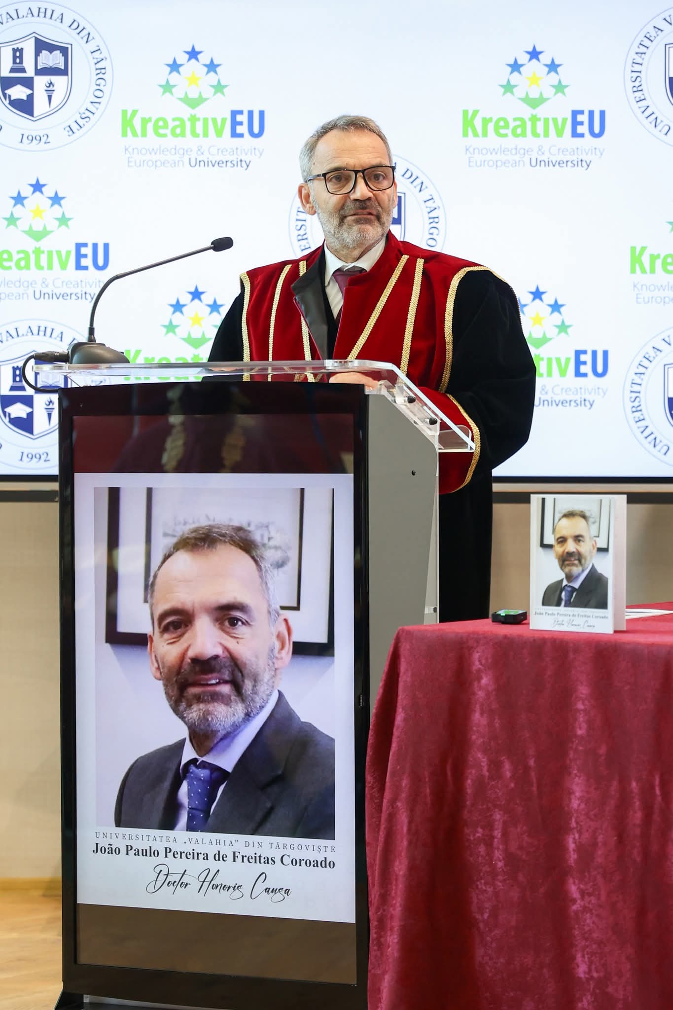 Ieri, 30 septembrie 2025, Universitatea „Valahia” din Târgoviște a organizat, în cadrul ședinței festive a Senatului universitar, o ceremonie solemnă prin care a conferit titlul onorific Doctor Honoris Causa domnului João Paulo Pereira de Freitas Coroado, președintele Universității Politehnica din Tomar și președintele Alianței Europene KreativEU.