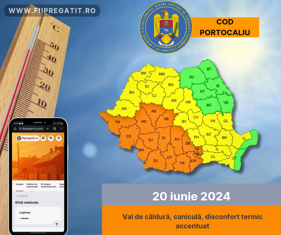 Avertizare meteorologică Cod Portocaliu valabilă pentru 20 iunie 2024, în tot județul Dâmbovița.